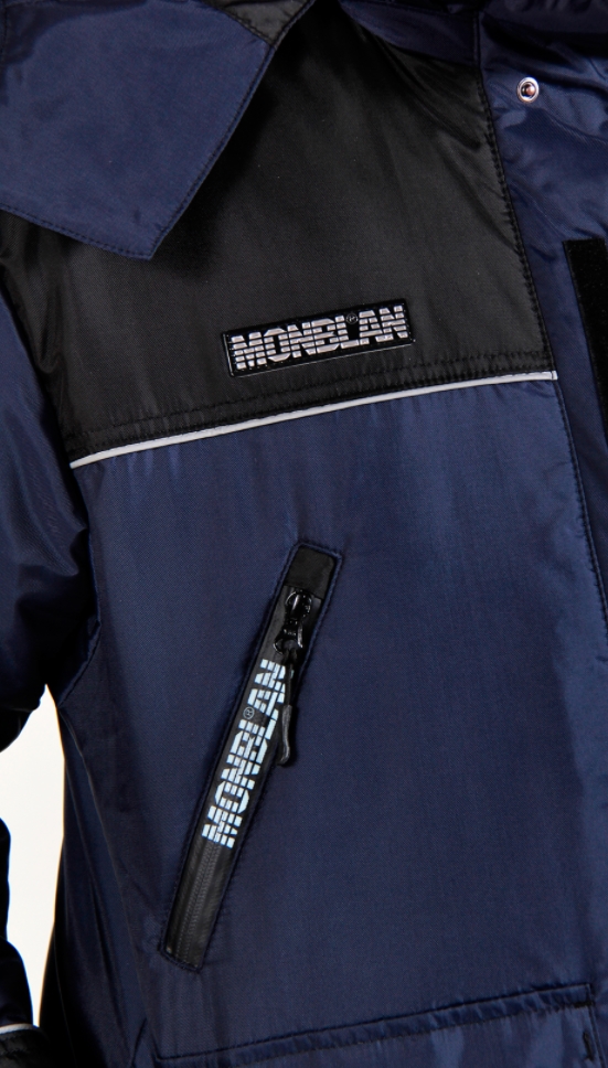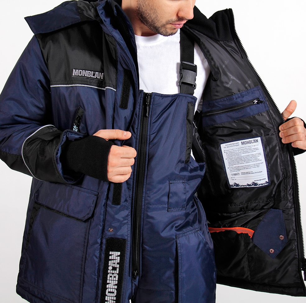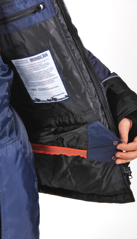 - Карманы: нижние накладные с двухсторонним входом с клапанами, верхние с влагозащитной молнией и логотипом МОНБЛАН, карман на рукаве, карманы на молнии на грудке полукомбинезона.